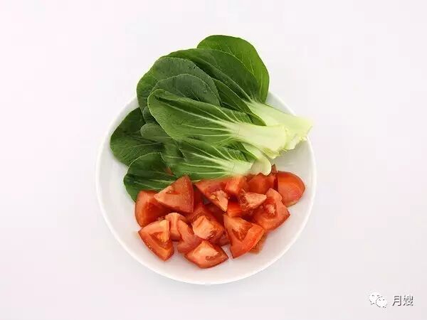 西红柿洗净切小块备用,小青菜心洗干净,撕成菜叶。