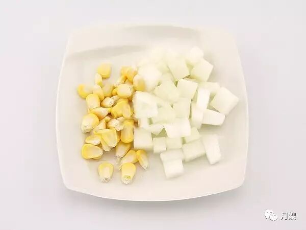 冬瓜去皮洗净切小块,玉米粒洗干净,沥干水分。